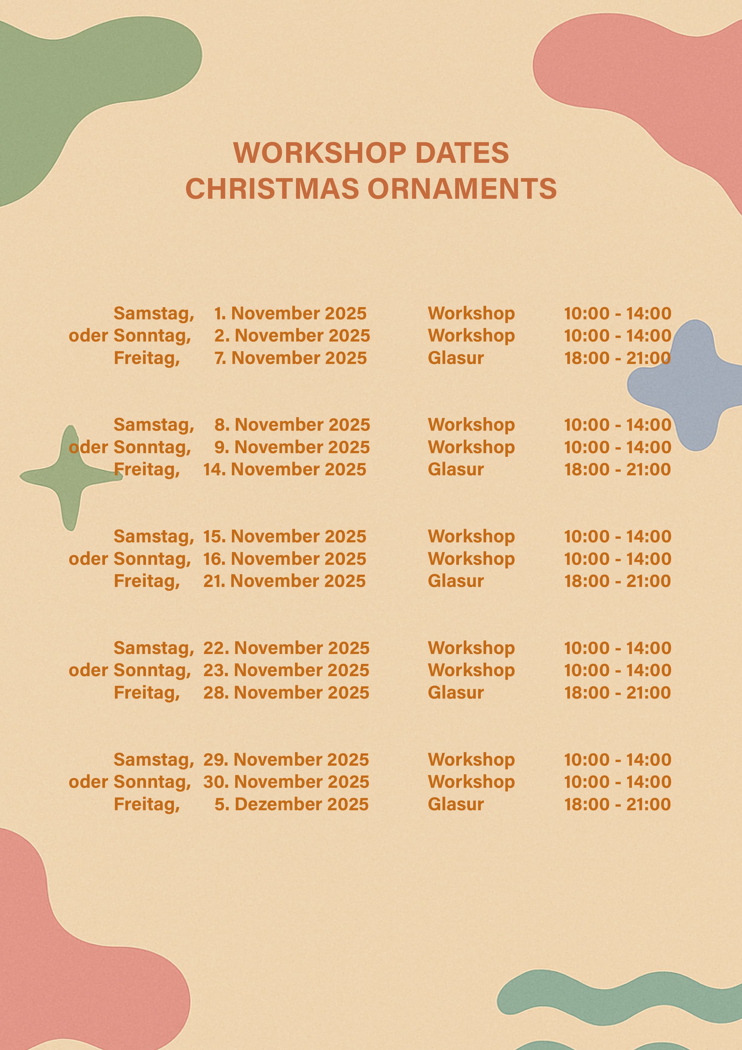 Am zweiten Kurstag werden wir die gegossenen Stücke nach dem Brennvorgang glasieren und sie einem weiteren Brennprozess unterziehen. Das bedeutet, dass ihr am Ende des Kurses eure eigenen Weihnachtskugeln nach Hause nehmen könnt.